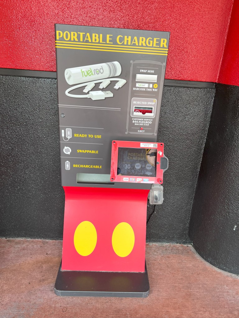 How to find a charging station – If you find yourself in the park having regrets about not bringing a portable charger with you, have no fear! Disney has stations located around each park where you can purchase a fuel rod. A fuel rod is a small portable charger that you can buy in the parks and even exchange at these machines if you need a fresh charge. Can’t find a charger station? You’re in luck. The My Disney Experience app can show you where to find these stations. If you go into the app and search “portable phone charging” a map will come up that will show you where all of the charger stations are located.
