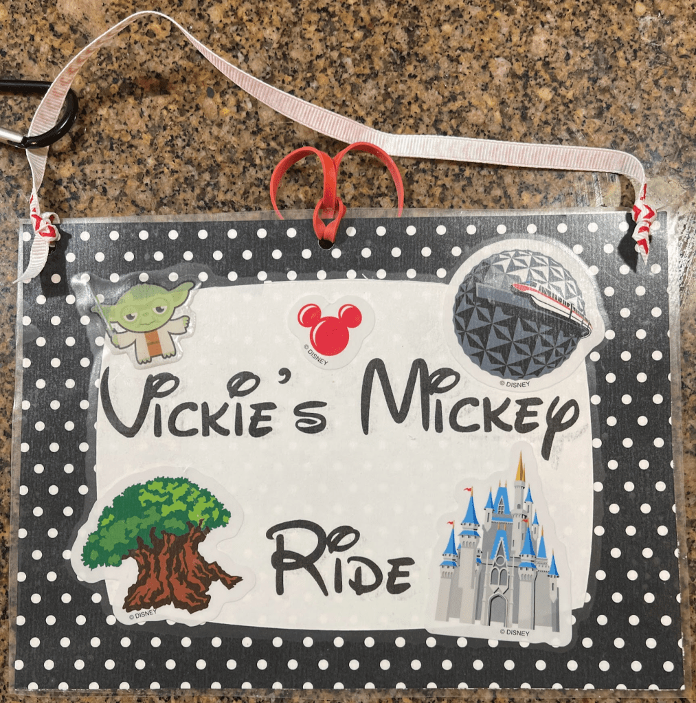 Pro tip: You will want to have a way to label your scooter. There are lots of scooters around Disney World and because the cast members will move them for you, you won’t always know where yours is. Below is the sign that I made for our scooter. As you can see, I put a few different attachment methods on it because we weren’t quite sure what the scooter would have on it. This was something I was able to quickly put together from some left-over craft supplies I had but if you’re not crafty you could easily print something from your computer or probably find one on Etsy.