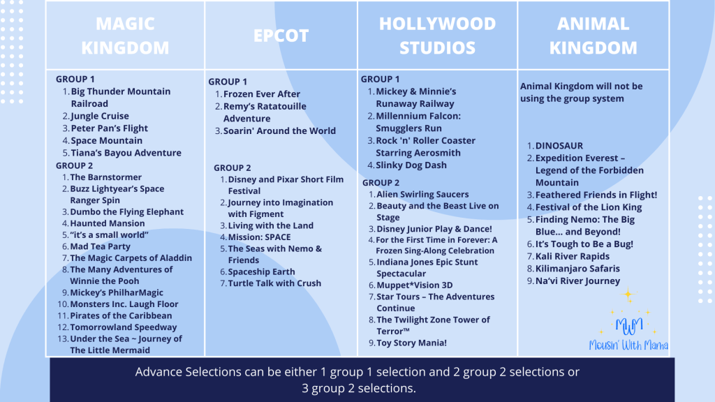 • Attractions are split into 2 groups for Magic Kingdom, EPCOT, and Hollywood Studios. When you make your initial selections, you can only select one attraction from group one. Your other two selections must come from group 2 or you can have all of your selections come from group 2. Animal Kingdom will not have a tiered system.