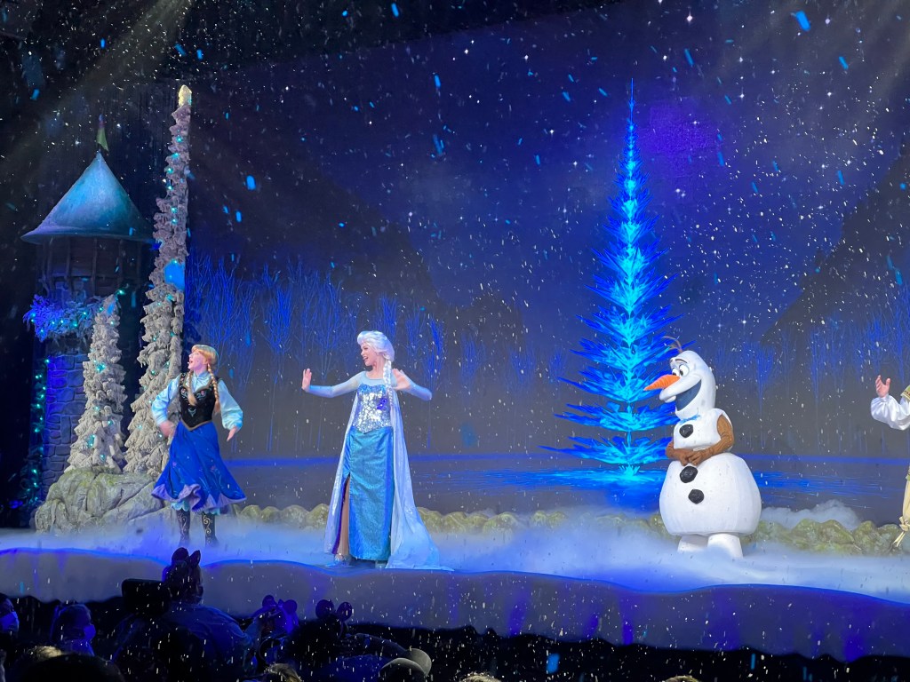 - For the First Time in Forever: A Frozen Sing-Along Celebration: This is also a show but instead of seeing the show acted out Broadway style, you’ll get to hear a comedic rendition of the Frozen story as told by a few of the townspeople. Your crew can enjoy some AC while singing along to all of their Frozen favorites and even experience a little magical snow.