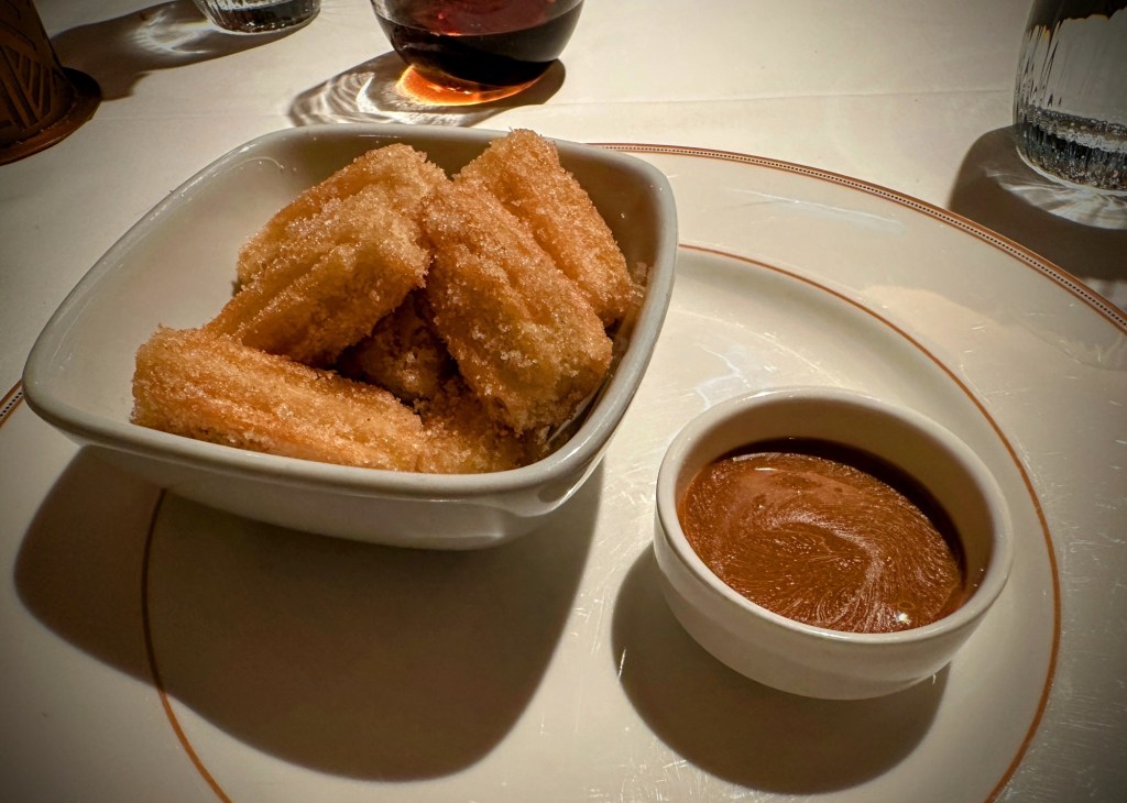 - 1923 – This quieter, more elegant dining room, themed after the golden age of Hollywood and Disney’s history is my personal fav on this ship. The restaurant had a dark but elegant old Hollywood vibe. There were displays of Disney artwork throughout the restaurant that gave a nod to the company’s history and the talent of the animators. The food here is top of my list. We really enjoyed the tortiglioni pasta, the filet, the caramel apple cheesecake, and the churros.